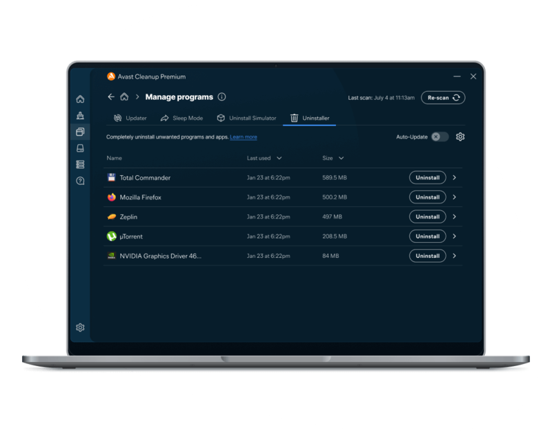 Tumutukoy ang bloatware sa lahat ng dati nang naka-install na software na hindi mo talaga kailangan at malamang na hindi mo gusto: mga app na hindi mo ginagamit, mga nakakagambalang toolbar, mga nag-expire na software trial, at adware na nagpapainis sa iyo ng mga popup o maaari pa ngang pag-espiya sa iyo. Masusing ii-scan ng Avast Cleanup ang iyong makina para tulungang maalis ang bloatware ng PC.